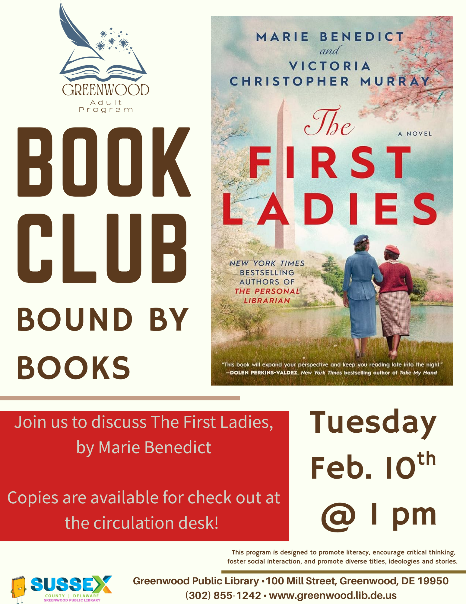 Bound by Books: The First Ladies Tuesday, February 10th at 1pm Participants come together once a month to discuss various types of books at the Greenwood Public Library. The book to be discussed on Tuesday, February 10th at 1pm will be, The First Ladies, by Marie Benedict. Pick up your copy at Greenwood Public Library. No registration is required. For more information call us at 302-855-1242.. This program is designed to promote literacy, encourage critical thinking, foster social interaction, and promote diverse titles, ideologies and stories to the general public.