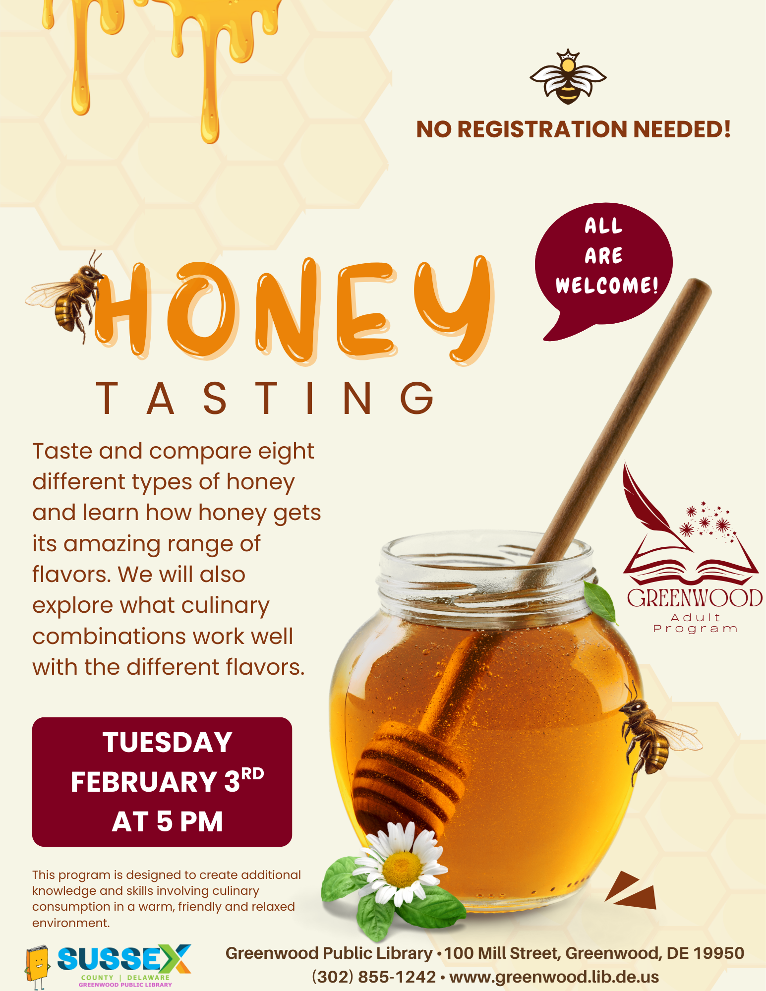 Honey Tasting Tuesday, February 3rd at 5pm Join us for a Honey Tasting at the Greenwood Public Library on Tuesday, February 3 @ 5pm Taste and compare eight different types of honey and learn how honey gets its amazing range of flavors. We will also explore what culinary combinations work well with the different flavors. For more information call us at 302-855-1242. This program is designed to create additional knowledge and skills involving culinary consumption in a warm, friendly and relaxed environment.