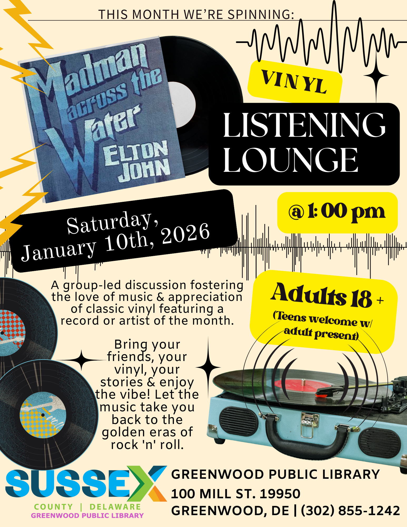 (Vinyl) Listening Lounge: Madman Across The Water - Elton John Saturday, January 10th at 1pm Join us this holiday season for our Vinyl Listening Lounge. This group-led discussion fosters the love of music & appreciation of classic vinyl, featuring a chosen record or artist of the month. FREE. Adults (& Teens 12+) Come vibe with us as we listen to Elton John's 1971 classic featuring his iconic single "Tiny Dancer" as well as "Levon" and other tracks. The discussion will focus on which tracks stand out to you, your favorite lyrics, rhythms, and melodies; why this album and its tracks continue to resonate with audiences of all ages; the artist's legacy; and the importance of discovering new music. Bring your friends, your vinyl, your stories, & enjoy the vibe! Let the music take you back to the golden eras of rock 'n' roll! 🎸✨ For more information, call the library directly at 302-855-1242.