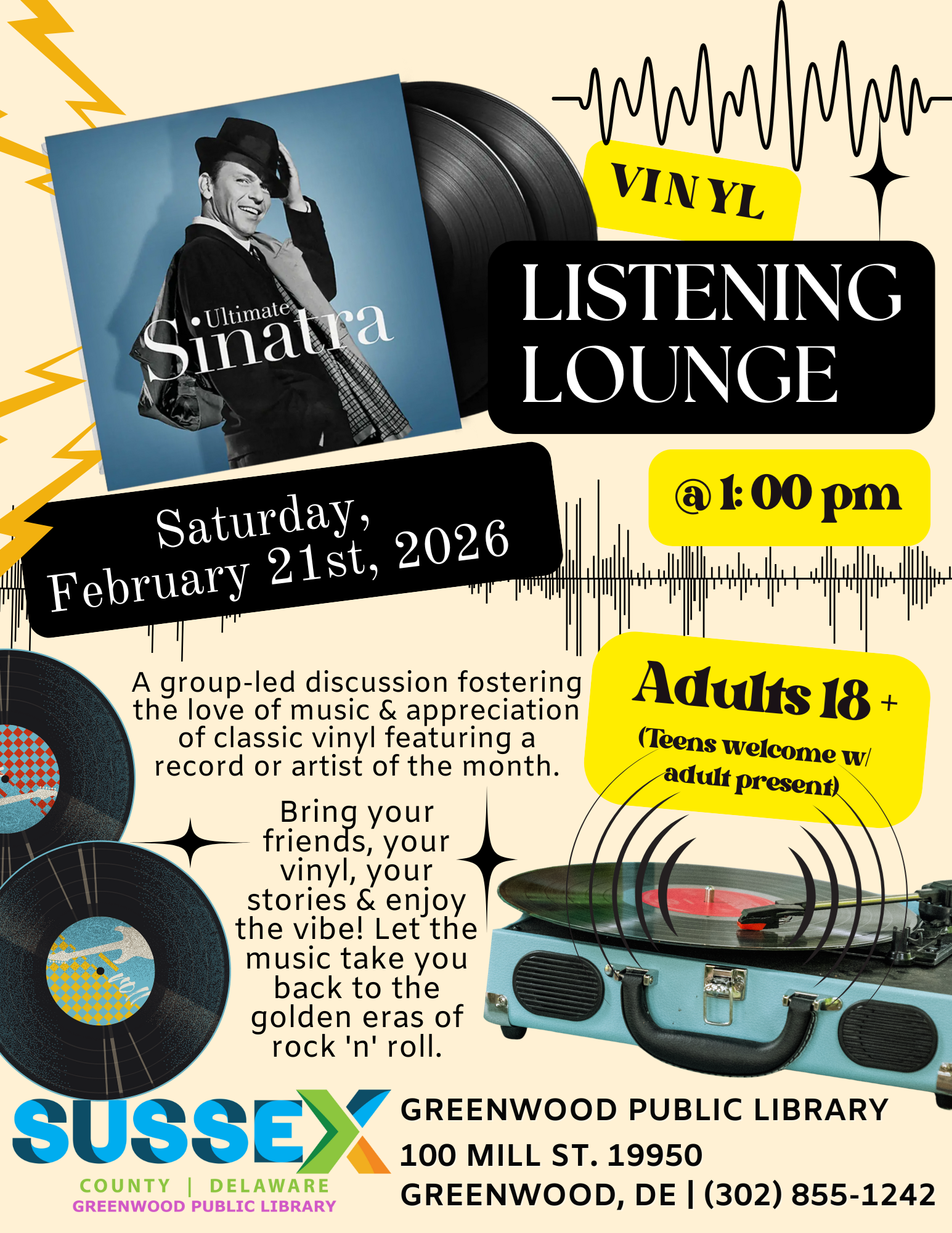 Vinyl Listening Lounge: Frank Sinatra Saturday, February 21st at 1pm Join us this for our Vinyl Listening Lounge - a group-led discussion fostering the love of music & appreciation of classic vinyl featuring a chosen record or artist of the month. FREE. Adults (& Teens 12+) The discussion will focus on which tracks stand out to you, your favorite lyrics, rhythms, and melodies, why this album and its tracks continue to resonate with audiences of all ages, and the artist's legacy. For more information, call the library directly at 302-855-1242. Bring your friends, your vinyl, your stories, & enjoy the vibe! Let the music take you back to the golden eras of rock 'n' roll! 🎸✨