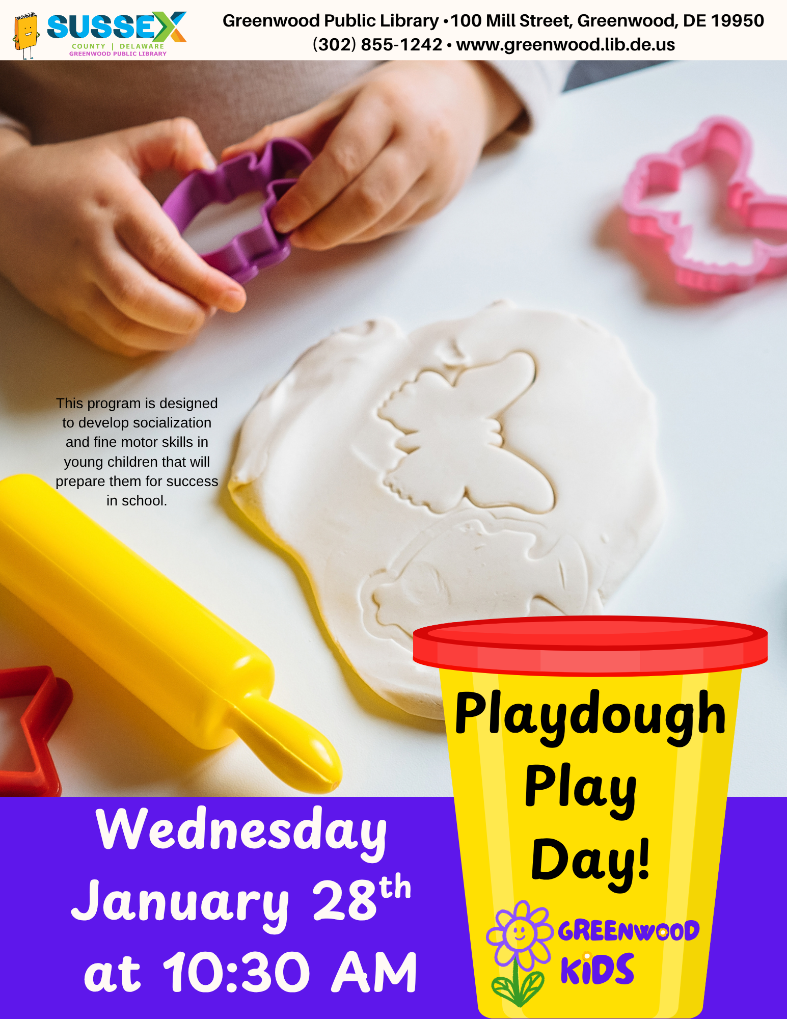 Playdough Play Day Wednesday, January 28th at 10:30am Bring your toddlers and preschoolers for a fun time with playdough and friends on Wednesday, January 28th from 10:30-11:30am. For further questions, please call the library at (302) 855-1242. This program is designed to develop socialization and fine motor skills in young children that will prepare them for success in school.