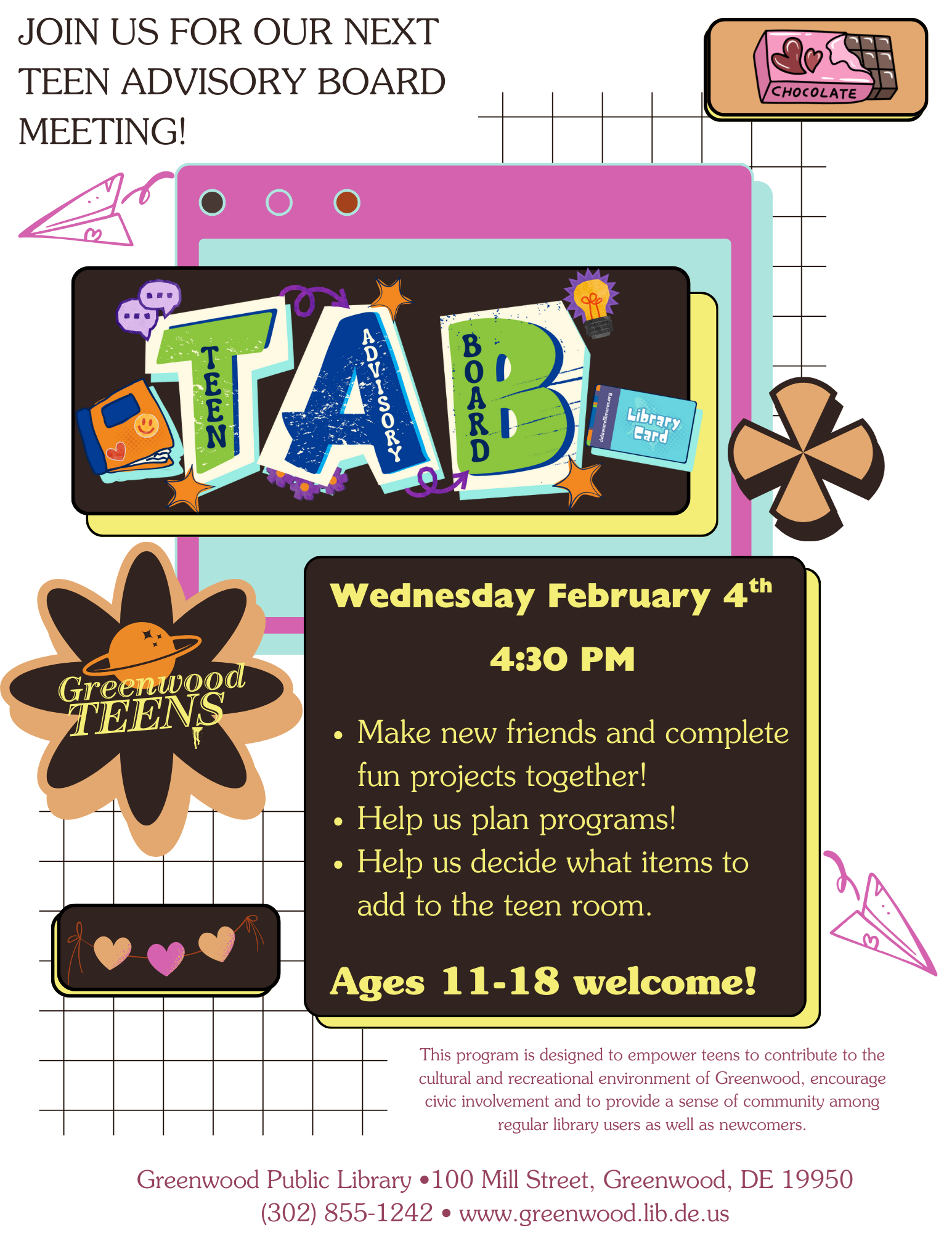 Teen Advisory Board Wednesday, February 4th at 4:30pm The monthly meeting of the Greenwood Public Library's Teen Advisory Board is on Wednesday February 4th at 4:30pm. Teens can come together at the Greenwood Public Library to collaborate, brainstorm, and share ideas while receiving the library’s support to bring your visions to life. Here, you have the opportunity to express your thoughts, plan innovative programs and displays, decide which materials should be available for teens, and connect with new friends. This program is designed to empower teens to contribute to the cultural and recreational environment of Greenwood, encourage civic involvement and to provide a sense of community among regular library users as well as newcomers. Ages 11+ For more info call 302-855-1242.