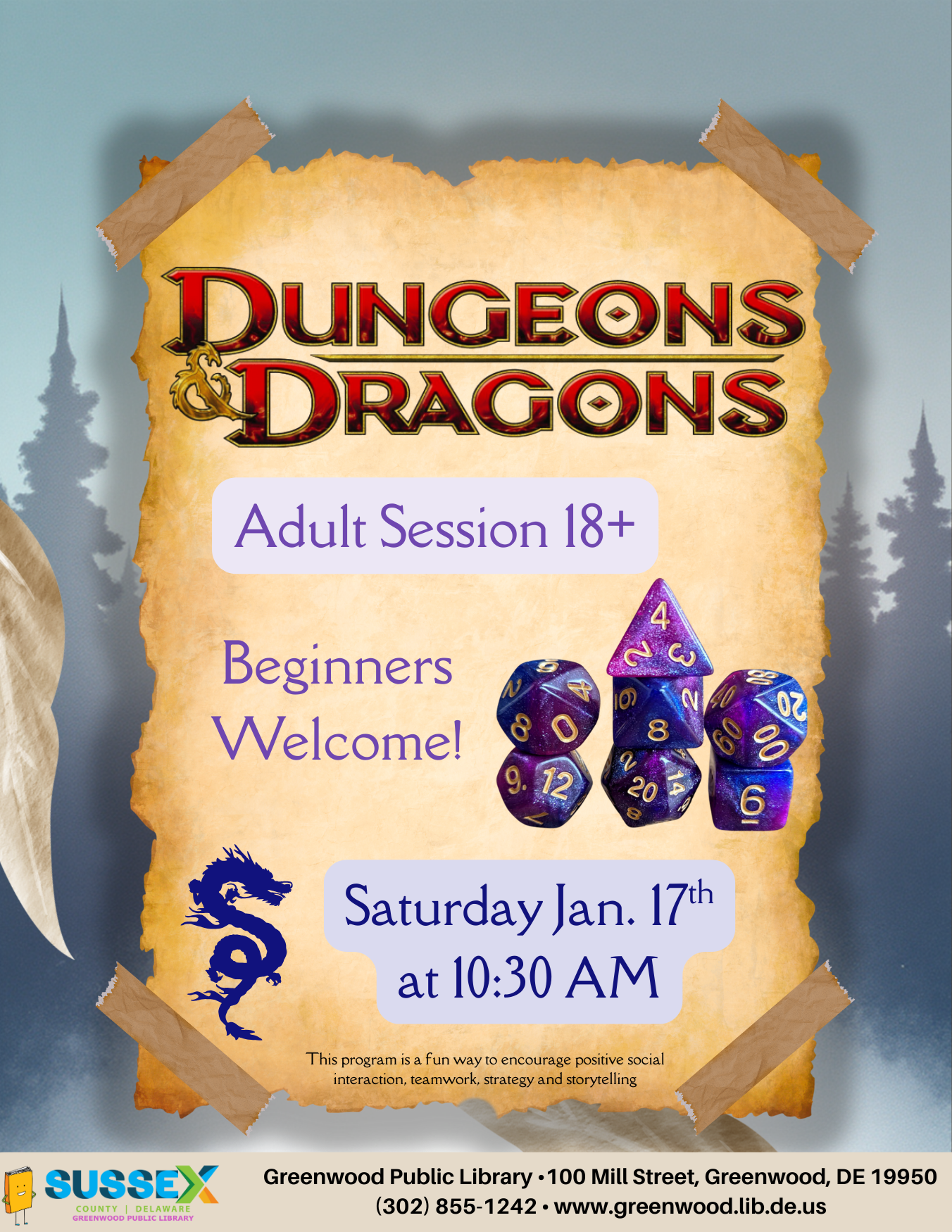 Dungeons & Dragons - Adults Saturday, January 17th at 10:30am Join the adult campaign of Dungeons & Dragons at the Greenwood Public Library on Saturday, January 17 from 10:30am to 2:30 pm. Led by an experienced Dungeon Master, this program promises a fun time for all. Adults 18+. Inexperienced attendees welcome. Space is limited, first come first served. For more information, call us at 302-855-1242. This program is a fun way to encourage positive social interaction, teamwork, strategy and healthy competition.
