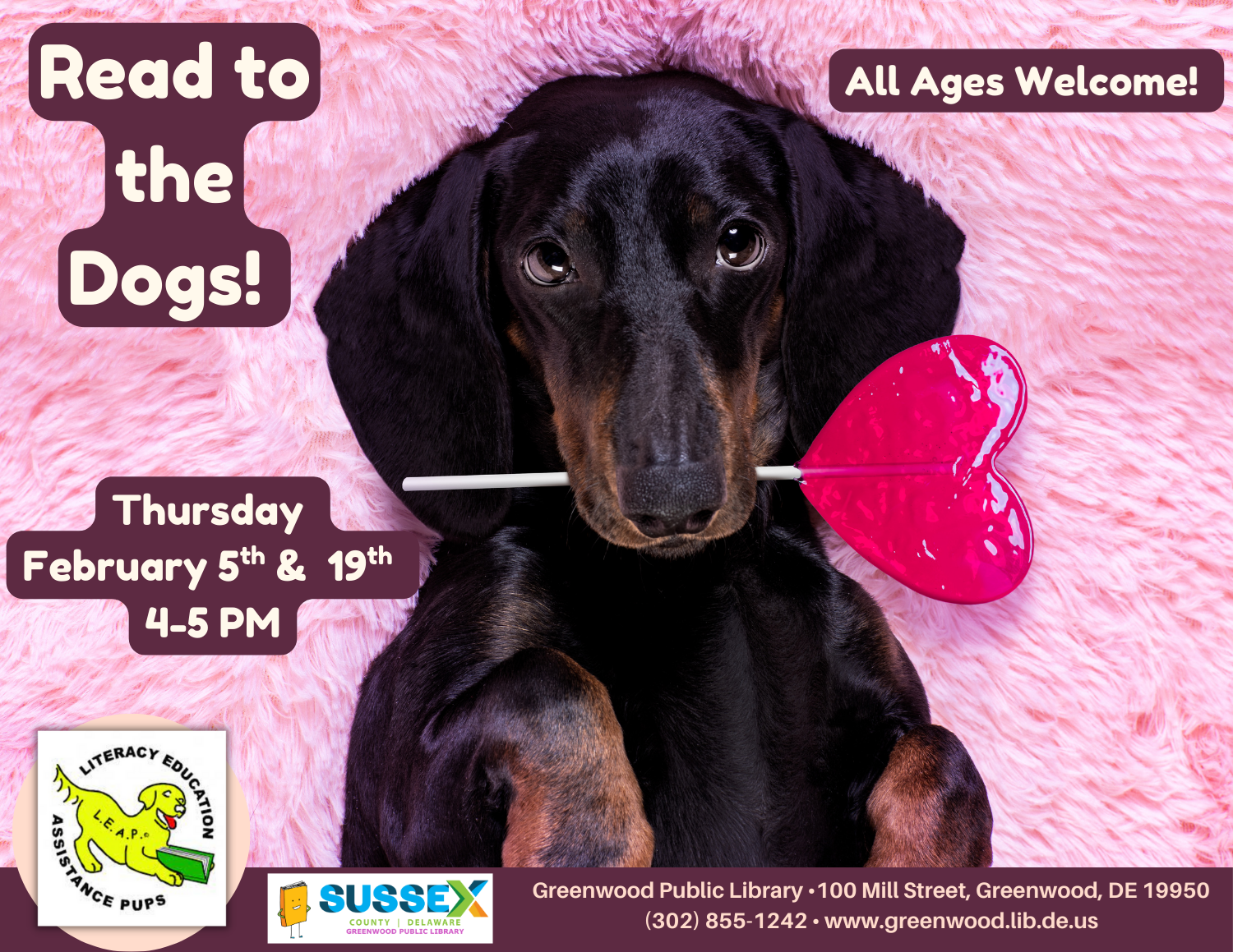 Read to the Dogs L.E.A.P. (Literacy Education Assistance Pups) Program – Read to the Dogs - is free and open to children of all ages. Come in to practice your reading and have a tail-waggin’ good time! L.E.A.P. sessions will be held at the Greenwood Library on the first and third Thursdays of the month. No registration is required; just come to the Greenwood Library any time between 4:00 and 5:00 p.m., choose a 4-legged, tail-wagging reading partner, and enjoy a good book together. Books are provided. For more information call us at 302-855-1242. This program is designed to foster a love of reading, promote the habit of reading, supplement formal education and improve social, motor and listening skills amongst our youngest patrons.