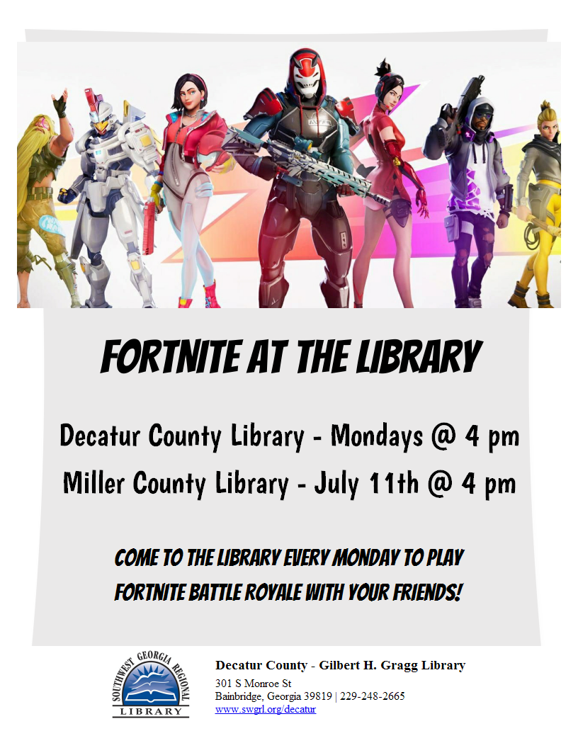 Fortnite at the Library 4 pm DEC Bainbridge Bookworms 6 pm DEC 9th Intro. Computer Class 10 am DEC* Toddler Time 10 am DEC Minecraft Club 4 pm MIL 10th Intro. Computer Class 10 am DEC* Chess Club 4 pm DEC 11th Intro. Computer Class 10 am DEC* Toddler Time 10 am DEC Fortnite 4 pm MIL 12th LAST DAY TO SUBMIT READING LOGS 15th Fortnite at the Library 4 pm DEC 16th Toddler Time 10 am DEC