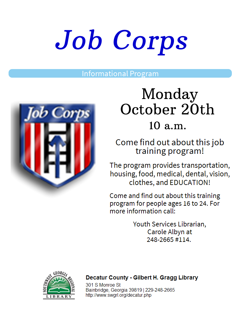 For advanced information visit: Job Corps online. People wanting to enroll should bring: Photo ID, Social Security Card, Birth Certificate, HS transcripts, immunization records and proof of income. This is a Federal program which is all inclusive for transportation, food, housing and training for youth ages 16 to 24.