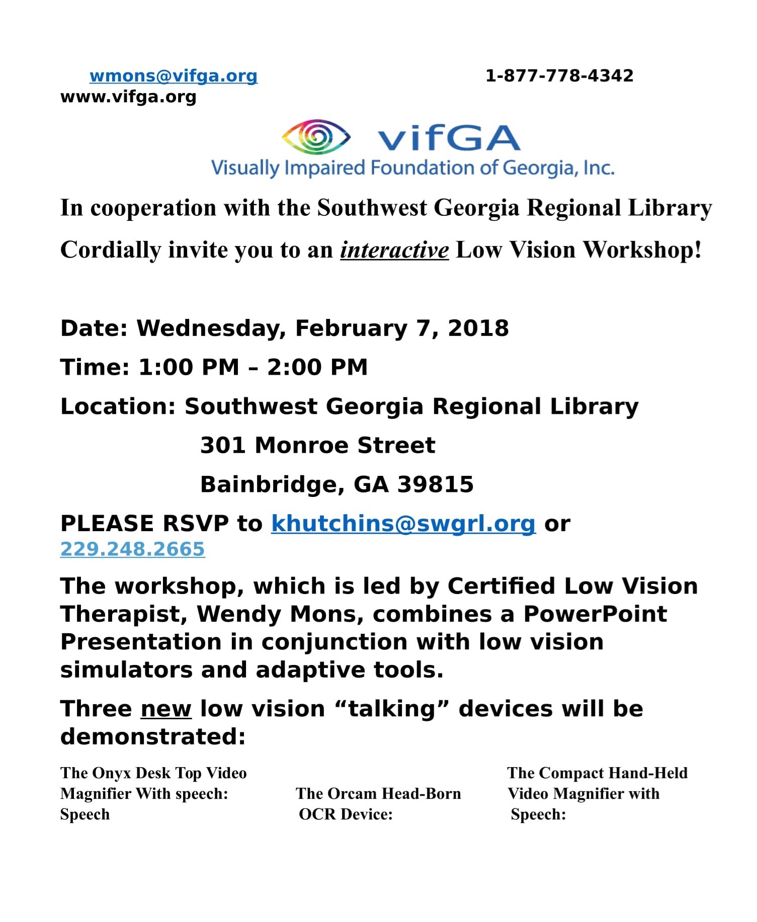 | Come to the Decatur County - Gilbert H. Gragg Library on February 7 at 1:00 pm for our Low Vision Workshop! For any questions about the workshop or any of the other services offered through SWGLAS, please contact us at 229-248-2680. |