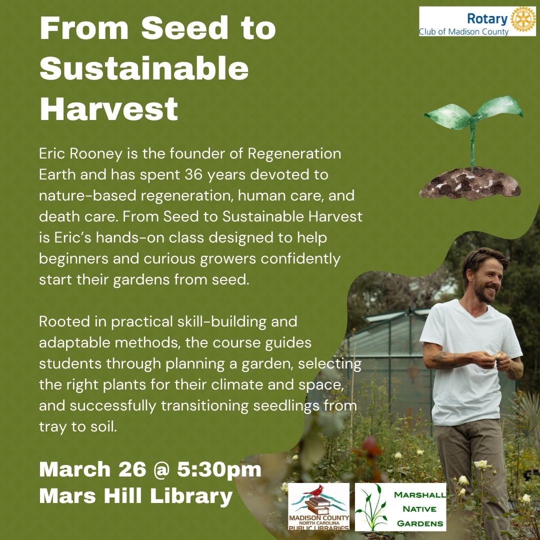Thursday, March 26th at 5:30pm in the Meeting Room of the Mars Hill Library we are hosting a free presentation by Eric Rooney, Founder of Regeneration Earth and a recognized land steward, gardener, and end-of-life care specialist. This will be a co-sponsored event with the Rotary Club of Madison County.