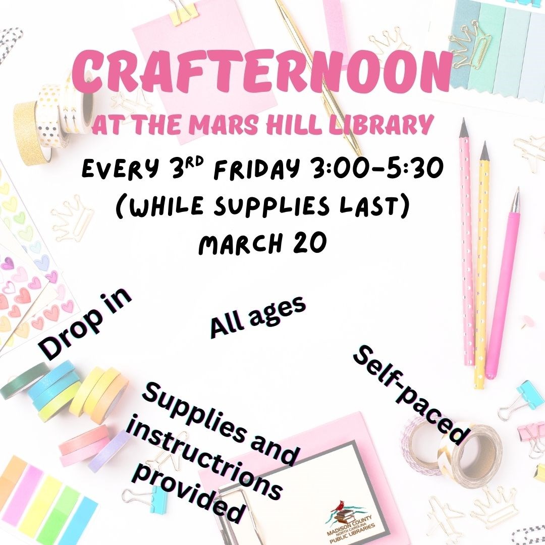 Meets on the second Thursday at 1pm and second Tuesday at 6pm at the Mars Hill Library
