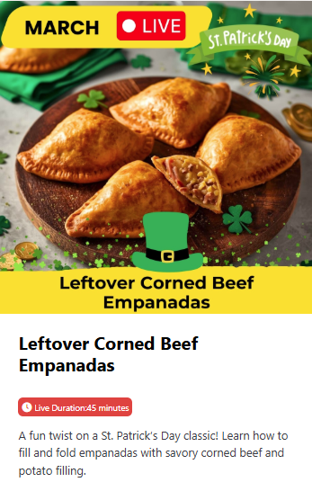Wednesday, March 4 • 6:30 pm Leftover Corned Beef Empanadas A fun twist on a St. Patrick’s Day classic! Learn how to fill and fold empanadas with savory corned beef and potato filling.