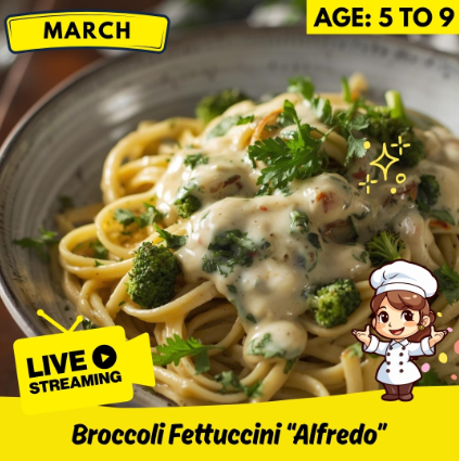 Wednesday, March 4 • 5 pm Broccoli Fettuccini “Alfredo” March is Noodle Month! Kids will learn to boil pasta perfectly and make a simple, delicious Alfredo sauce with broccoli!