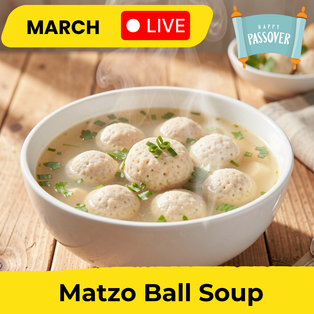 Wednesday, March 11 • 6:30 pm Matzo Ball Soup Celebrate the flavors and traditions of Jewish holidays. Learn how to prepare a classic dish that tells a story of heritage and culture. Matzo Ball Soup – comforting, symbolic, and perfect for family gatherings!