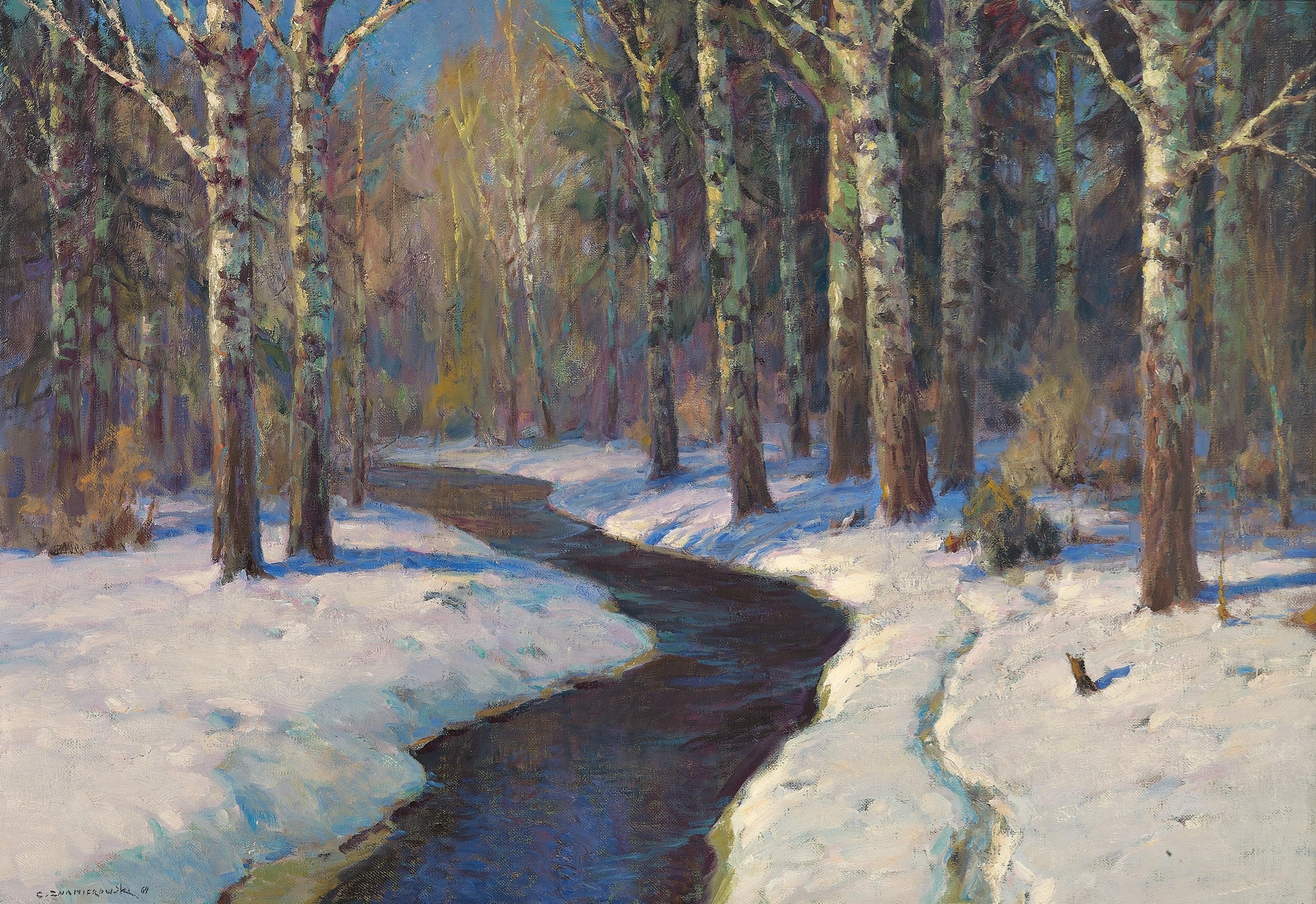 The Brook in FebruaryA snowy path for squirrel and fox, It winds between the wintry firs. Snow-muffled are its iron rocks, And o'er its stillness nothing stirs. But low, bend low a listening ear! Beneath the mask of moveless white A babbling whisper you shall hear— Of birds and blossoms, leaves and light. by Sir Charles George Douglas Roberts painting "Winter in the Forest" by Czesław Znamierowski (1890–1977)