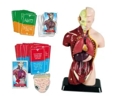 Ages 7+. Explore the human body from the inside out! Beginners and experts alike will enjoy this hands-on anatomy game. Each quiz card offers an easy question and a more challenging question to test players’ knowledge. Players answer the questions by simply locating the correct organs on the model.