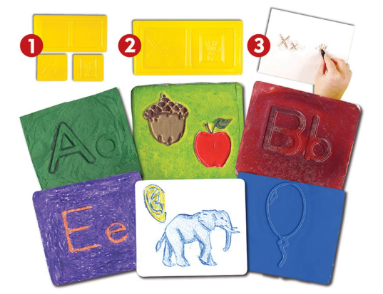 Ages 3+. These fun-to-use plates let kids create instant artwork from A to Z! Each plate has an upper- and lowercase letter, plus 2 images with the same initial sound. Also includes animal picture plates! Kids just place paper over the plates and rub with crayons to reinforce letter recognition, initial sounds and more!