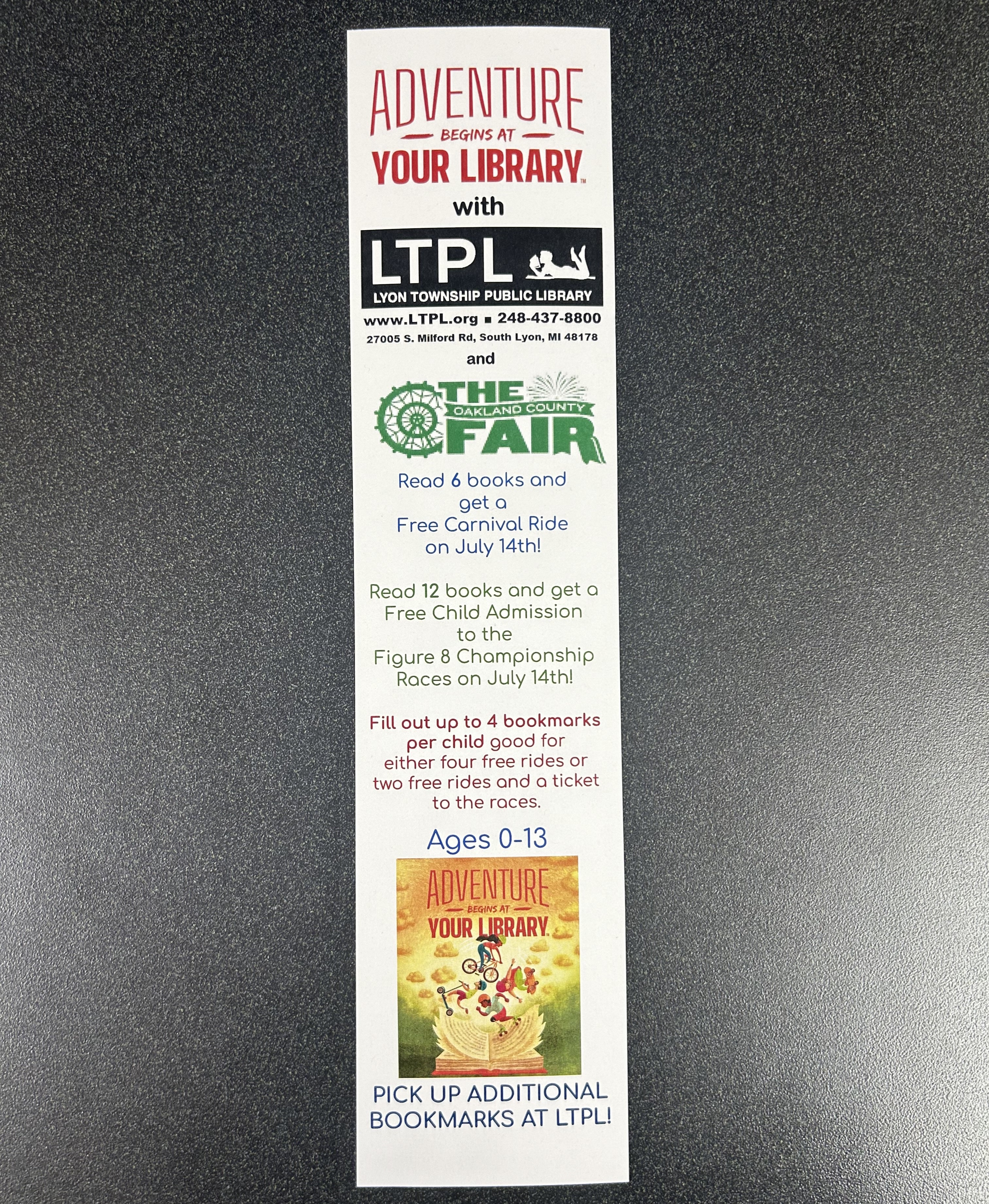 - If kids aged 0-13 fill in the titles of 6 books that they have read on a bookmark, they can get a free carnival ride at The Fair on Friday, July 12.