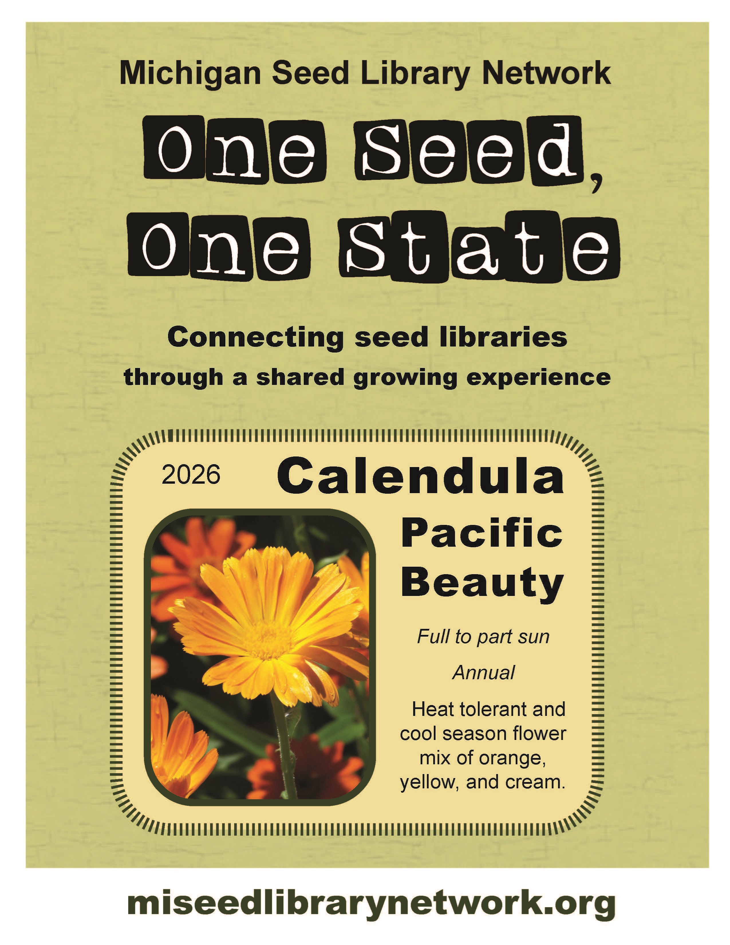 One Seed, One State Each year, the MI Seed Library Network selects an open-pollinated, seed-grown plant selection and distributes them to Michigan Seed Libraries so they can share them with their patrons. This year's selection is 'Pacific Beauty' Calendula! Calendula is a lovely flower in shades of yellow, gold, and orange and it grows well in cool weather. Not only is it a beautiful flower, the plant is also a healing herb. Seeds will be available at LTPL in March. Watch for the display!