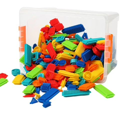 Ages 3+. Bristle 3D Blocks are perfect for building fine motor skills and hand-eye coordination, while stimulating curious minds. They are crafted with soft, rubbery 'bristles', allowing children to easily connect pieces together at any angle. This brightly colored 120-piece set provides endless building possibilities to fuel kids' imaginations and creative juices. It also includes 12 rolling wheels that add motion to objects--build an airplane, car, dump trucks, robot and other creations!