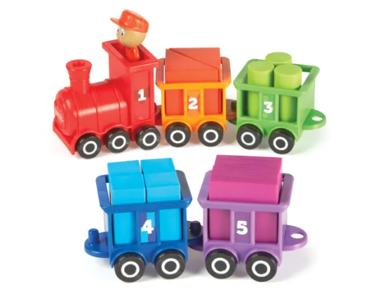 Ages 2+. All aboard the learning express! Build number, shape and color recognition skills with this fun interactive train set featuring rolling wheels and an easy-to-grab size that's perfect for little hands. Kids can sort the blocks by shape and color, count the total number found in the train, and build fine motor skills while loading the blocks back into the right train cars. They can also use the blocks as construction toys, stacking and building with them during free-play imaginative adventures.