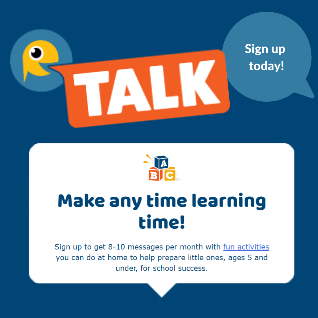 - TALK sends 2-3 text messages with fun activity suggestions each week that parents and caregivers with children 5 and under can do to build school readiness skills.