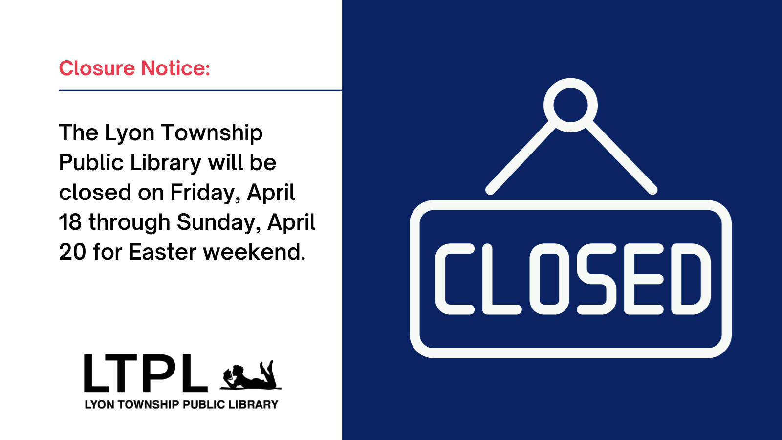LTPL will be closed all day on Tuesday, November 11 for Veteran's Day. We will re-open on Wednesday, November 12 for our regular hours.
