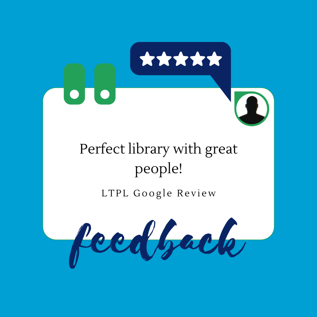 When you leave a review for our library on Google or elsewhere, we can use your valued feedback to improve our resources and services. These reviews also help to build a trustworthy resource of community opinions for current and potential library users to reference. Brighten our day, provide your constructive feedback, and leave LTPL a review on Google!