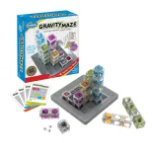 Ages 8+. Player draws a challenge card and places towers on the grid as indicated. The goal is to create a maze that will carry a marble from the start position to the target tower.