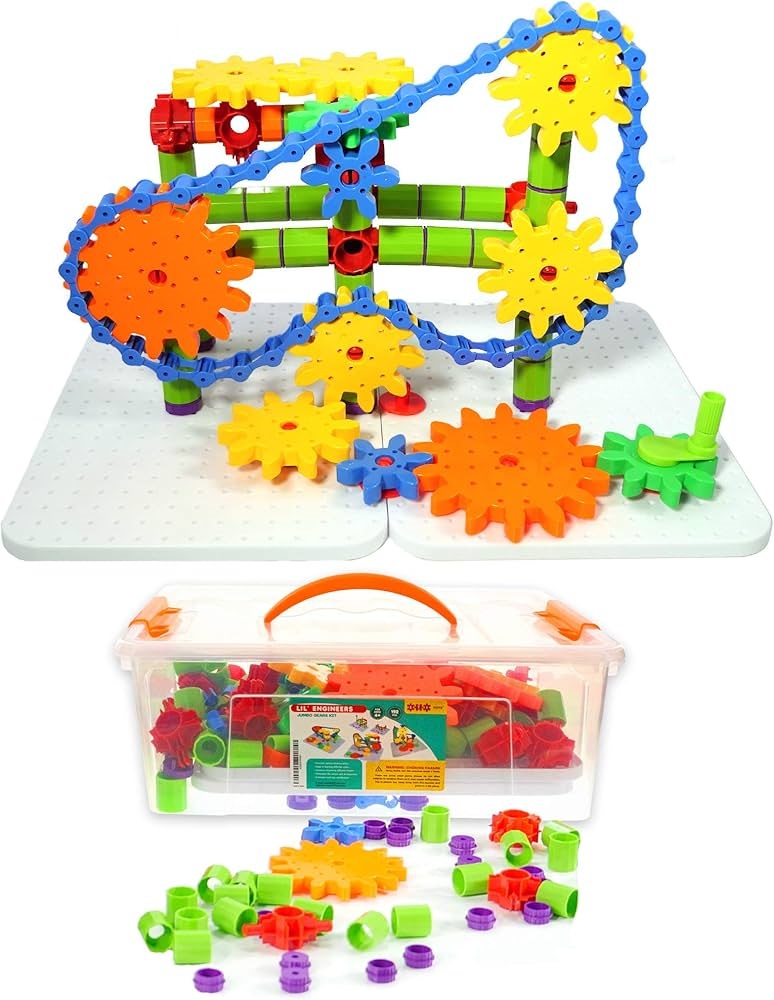 Ages 4+. Create a winding gear train, a cranking tower with a fan or any wacky interlocking contraption you can imagine! Build tall, build wide ... Or both! The possibilities are endless! Supports STEM by encouraging creativity, design, critical thinking, problem solving and step-by-step construction.