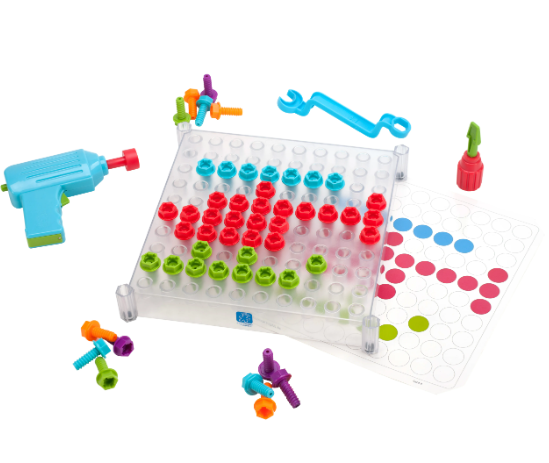 Age 3+. With this kit, children design their own learning fun! The sturdy board, big bolts, colorful activity cards, and realistic tools encourage young learners to develop a variety of important skills, from color recognition and counting to fine-motors skills and following directions.