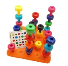 Age 2+. Play with pegs and a pegboard! Create patterns with the colors, stack them into towers, and help develop fine motor skills while you build. When you're done, knock them over and try again!
