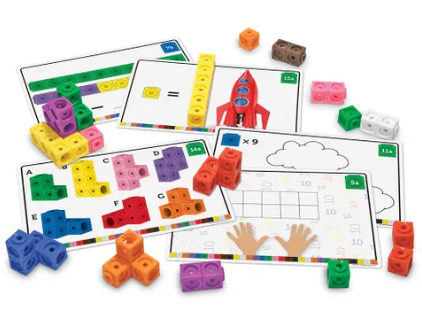 Ages 4+. This set pairs 100 cubes with 30 learning challenges that make math lessons fun. Using the colorful cubes as a handy visual aid, learn addition and subtraction, practice sequencing through color & shape recognition, and experience perspective through 3-D building challenges. They also double as fun building toys!