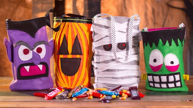 Your little ghouls and goblins will shriek with delight over handmade Trick or Treat bags. They are super simple and fun to make — and even easier to customize. With a little felt, scissors and a sewing machine you can make your very own felt fiend, mummy or jack-o-lantern.