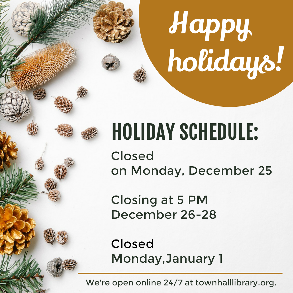 Town Hall Library will have the following schedule during the upcoming holiday season: