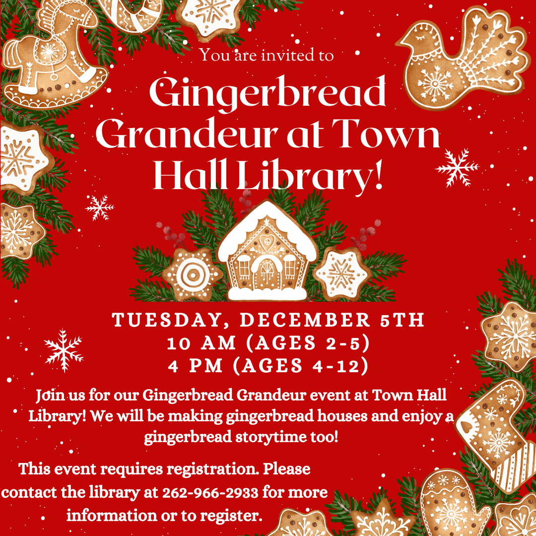 Join us for our Gingerbread Grandeur event at Town Hall Library! We will be making gingerbread houses and enjoy a gingerbread storytime too!