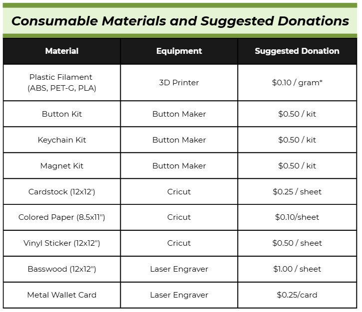A list of currently available machine-compatible materials are listed below, as well as a recommended donation amount if you use these materials.