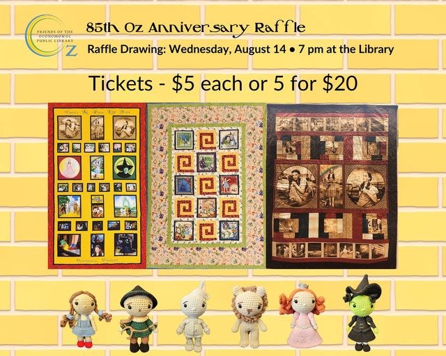 Volunteers will be selling raffle tickets for a chance to win one of three handmade quilts and a set of adorable crocheted Oz characters created to celebrate the 85th anniversary of the world premiere of The Wizard of Oz. All items were handmade by local crafters! Proceeds go to the Friends of the Oconomowoc Public Library. This raffle is completely run by volunteers and tickets cannot be sold by Library staff. Friends of OPL plan to sell tickets on Saturday mornings during the Farmers Market and Wednesday evenings before the Legion concerts from now until the drawing on August 14.
