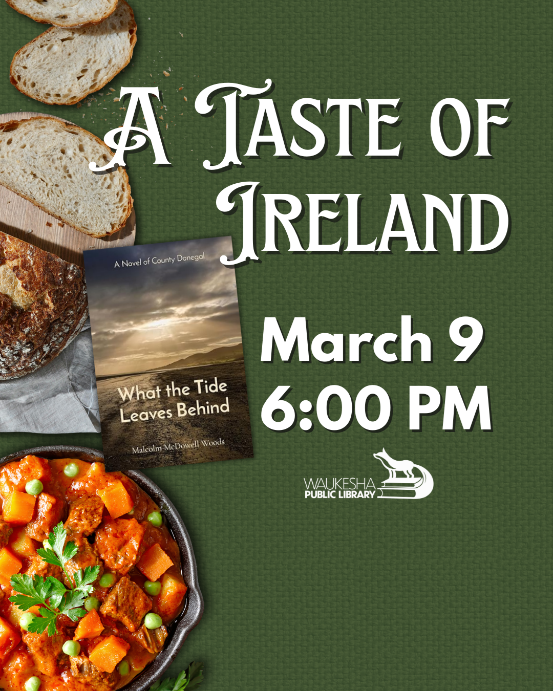 A Taste of Ireland with Malcolm McDowell Woods March 9 @ 6:00 PM Waukesha Public Library Enjoy a delicious sample of Irish stew and soda bread as local author Malcolm McDowell Woods shares the inspiration behind his novel What the Tide Leaves Behind: A Novel of County Donegal. Learn more about County Donegal, the setting of his book, and the history behind these beloved Irish recipes. Copies of the book will be available for purchase. Registration is required.