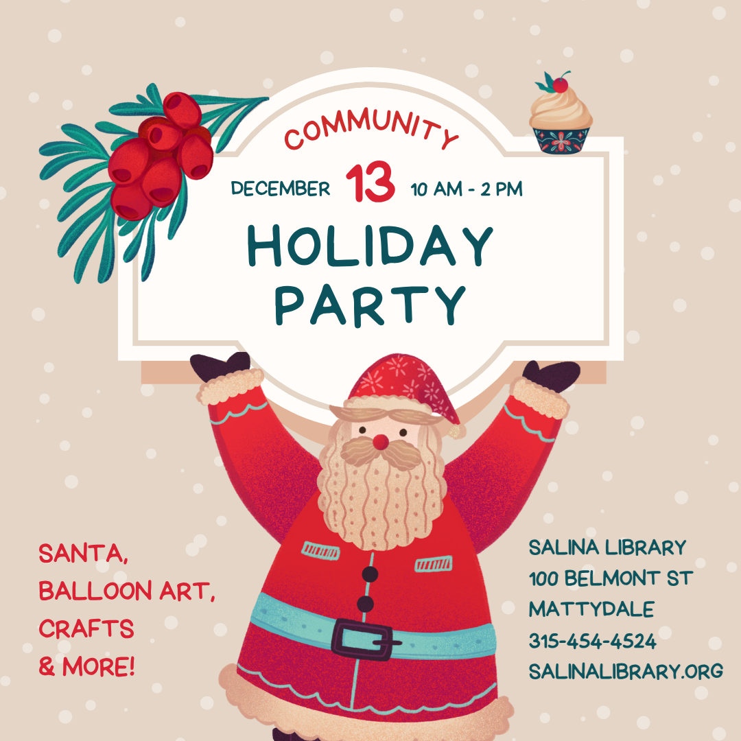 Community Holiday Party Saturday, December 13 at 10:00 am Come and celebrate the holidays with us on 12/13 from 10:00 am until 2:00 pm. Kids can visit with Santa, drink holiday punch, see the balloon artist, do a craft, get a holiday tattoo, and then get a small gift!