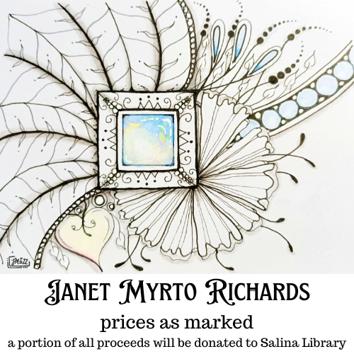 Art Exhibit & Sale Throughout the Month of January View the art of Janet Myrto Richards throughout the month of January. Ms. Richards creates her art with layers of different pens, pencils, and paints. If you’re interested in learning more about her techniques, just ask! She’s an employee of Salina Library. A portion of each sale will be donated to the library.