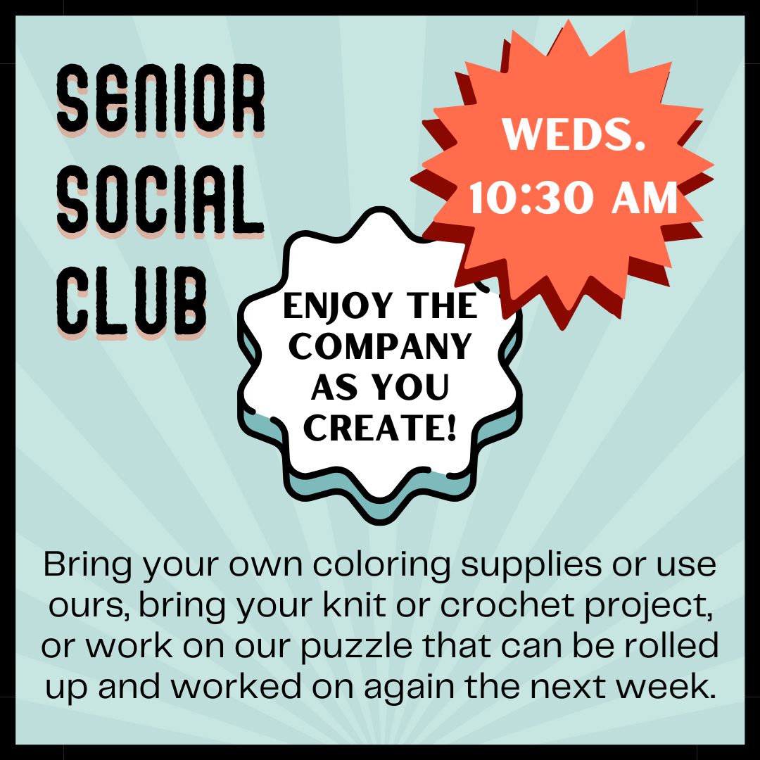 Senior Social Club Wednesdays at 10:30 am Enjoy the conversation as you create! Bring your own coloring supplies or use ours, bring your knit or crochet project, or work on our puzzle that can be rolled up and worked on again the next week. Don’t like to craft? Just hang out and make friends. For adults 50+. Please register.