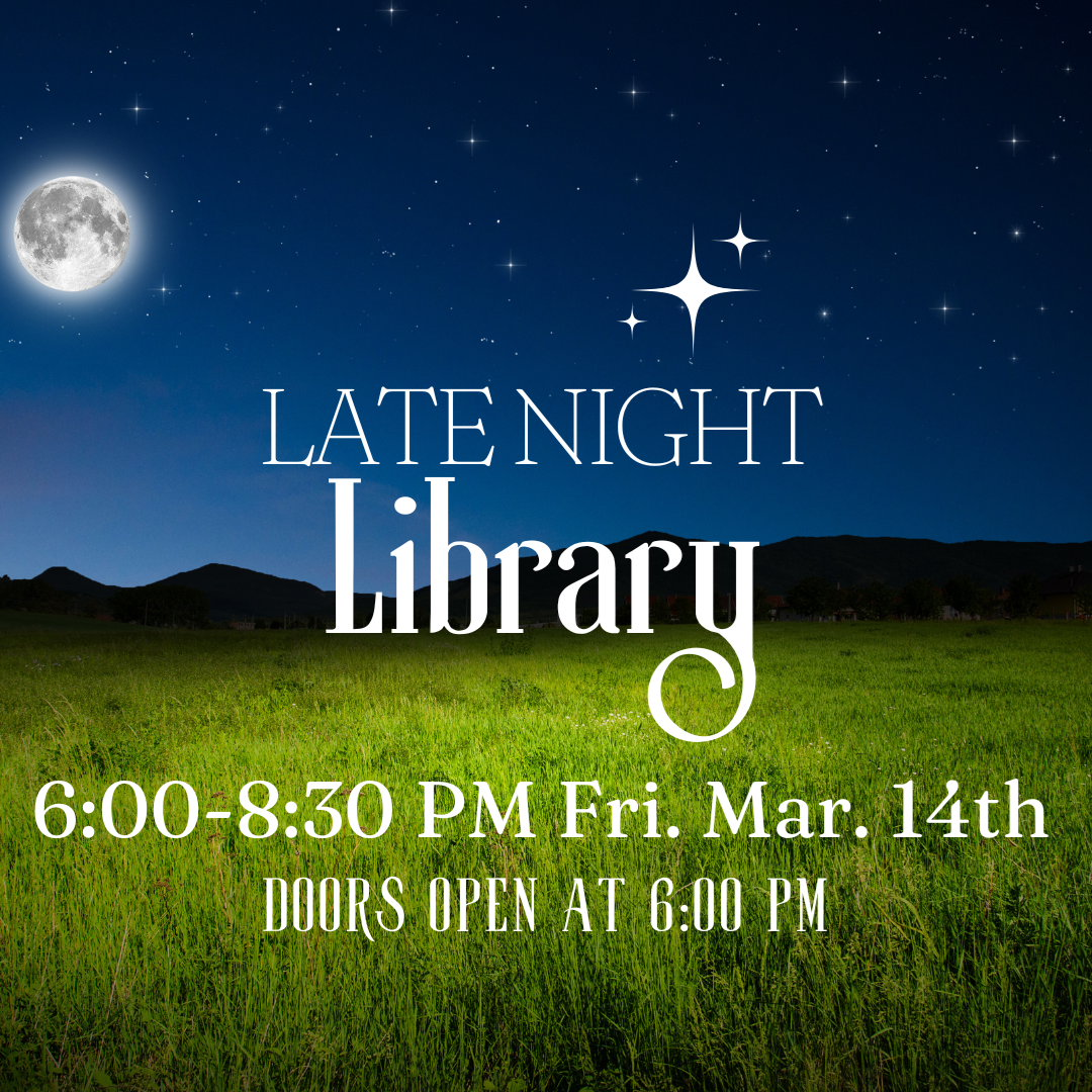 Late Night Library Friday, March 14, Doors Open at 6:00 pm Late Night Library is a great opportunity to borrow and return books or use one of our computers outside of regular working hours. Looking for a place to study? Sit in our Quiet Space, borrow a Chromebook, use our WiFi, or get some coffee. For adults 18+.