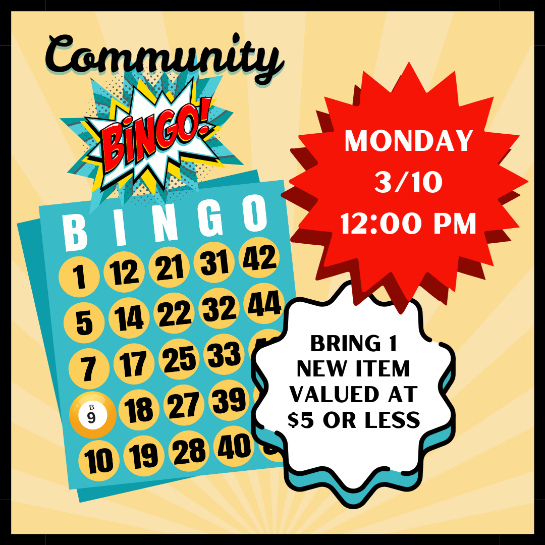 Community Bingo Monday, March 10 at 12:00 pm Socialize and have fun playing bingo! Bring a new item under $5 for the prize table; it can be anything from a candy bar to a bar of soap. Use your imagination! You are welcome to bring your own snacks and drinks, or there are some for sale at the library. For adults 18+. Registration is required.