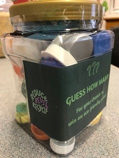 Guess the number of lids in the jar for a chance to win an eco-friendly prize. There are three different jars and prizes stationed in the Children's Room, Teen Area, and the circulation desk. You may enter answers at any (or all) of the stations. The person with the closest guess will win the prize next to that jar.