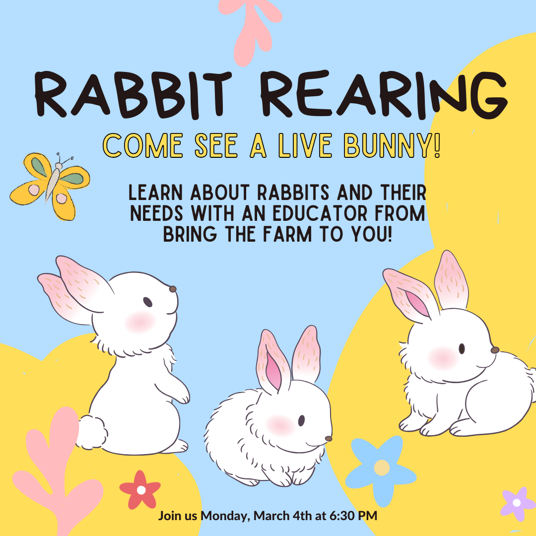 Learn about rabbits and their needs with an educator from Bring the Farm to You. Learn how rabbits interact with humans and their environment. Meet a live bunny!