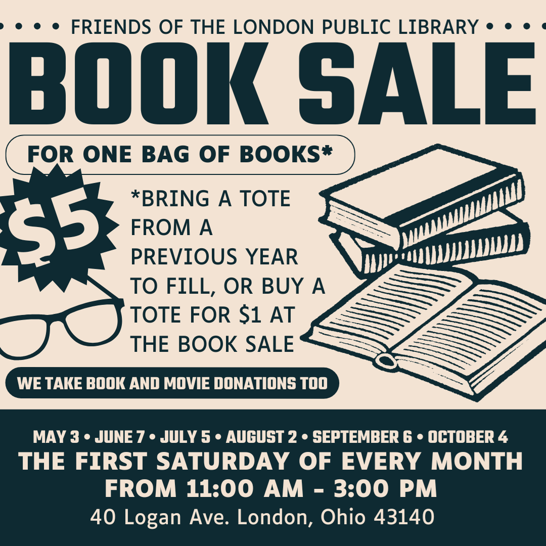 Visit the Book Nook May-October on the first Saturday of each month from 11 a.m. to 3 p.m. for great deals on books, DVDs, and more! Bring a bag from previous years to fill up with books and pay only $5! There are children's books, teen, fantasy, mysteries, thrillers, adult, crime, nonfiction, cookbooks, self-help, romance, and more. Help support your London Public Library by shopping locally for your books!