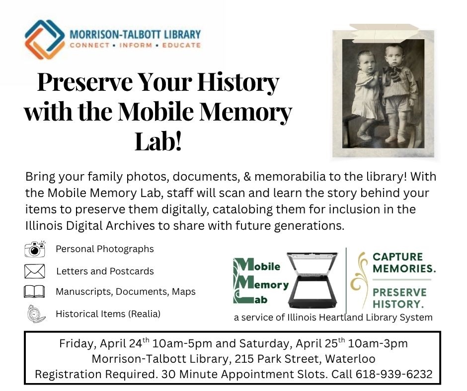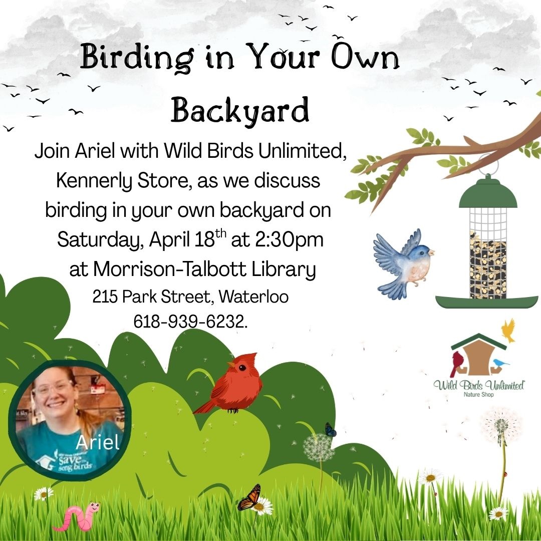 As spring arrives, Morrison-Talbott Library is excited to bring a variety of engaging outreach programs to our community. We’re especially looking forward to a library card sign-up day at Garden Place Senior Living Waterloo on Monday, April 20th from 10:30 a.m. to 1 p.m. Residents can sign up for their own library card and enjoy the convenience of having books, magazines, movies, and more delivered right to their door every two weeks using our new library van. This service is also available to anyone who is temporarily or permanently homebound—just reach out to the library, and we’ll be happy to bring materials to you. For those interested in family history, the Mobile Memory Lab will visit the library on Friday, April 24th from 10 a.m. to 5 p.m. and Saturday, April 25th from 10 a.m. to 3 p.m. In partnership with the Illinois Heartland Library System, this program offers a wonderful opportunity to preserve your treasured photos, documents, and memorabilia. Items will be scanned on-site, and participants will receive digital copies on a thumb drive. These materials will also be added to the Illinois Digital Archives to help share local history with future generations. Appointments are required and scheduled in 30-minute time slots. In addition, the Daughters of the American Revolution will host an informational open house on Friday, April 17 from 1–4 p.m. This is a great opportunity to learn more about the organization or get started on your patriot lineage paperwork, especially fitting as we celebrate America’s 250th anniversary. To round out the month, join us on Saturday, April 18th at 2:30 p.m. for a fun and informative backyard birding program with Ariel from Wild Birds Unlimited. Whether you’re a seasoned birding enthusiast or just getting started, this program is a great way to learn tips and connect with others who share your interest. We hope you’ll join us for these wonderful programs and take advantage of all the library has to offer this season! For more information contact us at 618-939-6232 or mtl@waterloolibrary.org. Sherri Adult Services Coordinator