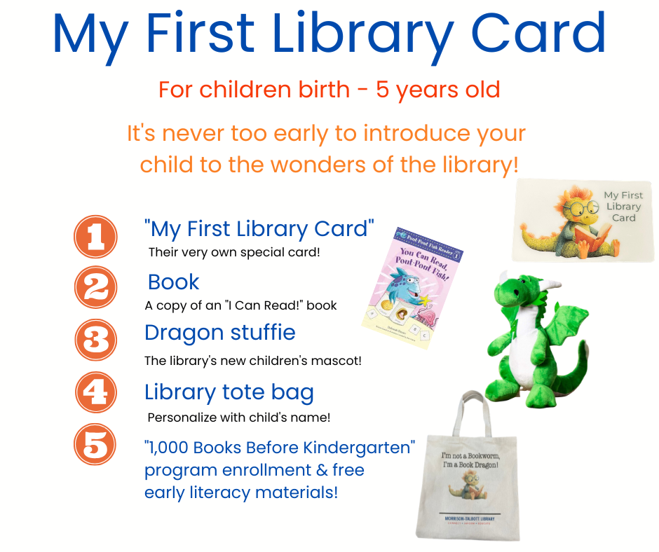 Having Fun Isn’t Hard, When You’ve Got a Morrison-Talbott Library Card! At Morrison-Talbott Library, we offer library cards for all ages, and yes, even babies can have one of their very own! Our “My First Library Card” program is designed especially for children from birth to age five. When they sign up, they’ll receive a special library card, a tote bag, a book, and a cuddly dragon stuffed animal, along with enrollment in our “1,000 Books Before Kindergarten” program. There’s no better time to make library visits part of your family’s routine. Reading helps children learn, grow, and imagine, while also building important lifelong skills. The books we share with children from an early age can shape their interests, spark curiosity, and help them better understand the world around them. And for kids & teens, there’s something truly empowering about choosing books and using their very own library card to check them out, so you should definitely sign them up for their own card if you haven’t already! We even offer a variety of fun card designs, including a dragon, hamster, and cat.  Did you know that reading to your child is one of the most powerful ways to support early learning? Sharing books helps develop pre-reading skills such as recognizing letter sounds, building vocabulary, and gaining background knowledge, all important for learning to read and kindergarten readiness. And our “1,000 Books Before Kindergarten” program makes it easy and fun to build a daily reading habit. Any child who has not yet started kindergarten can participate. After signing up, families receive a folder with tracking sheets and early literacy tips. Each book read earns a star, and every 100-book milestone is celebrated with a special sticker. When children complete the program, they receive a backpack filled with books and school supplies, and their achievement is recognized in the newspaper. We hope to see your family at the library soon to share in the joy of reading! Warmest regards, Ms. Stephanie Youth Services Coordinator