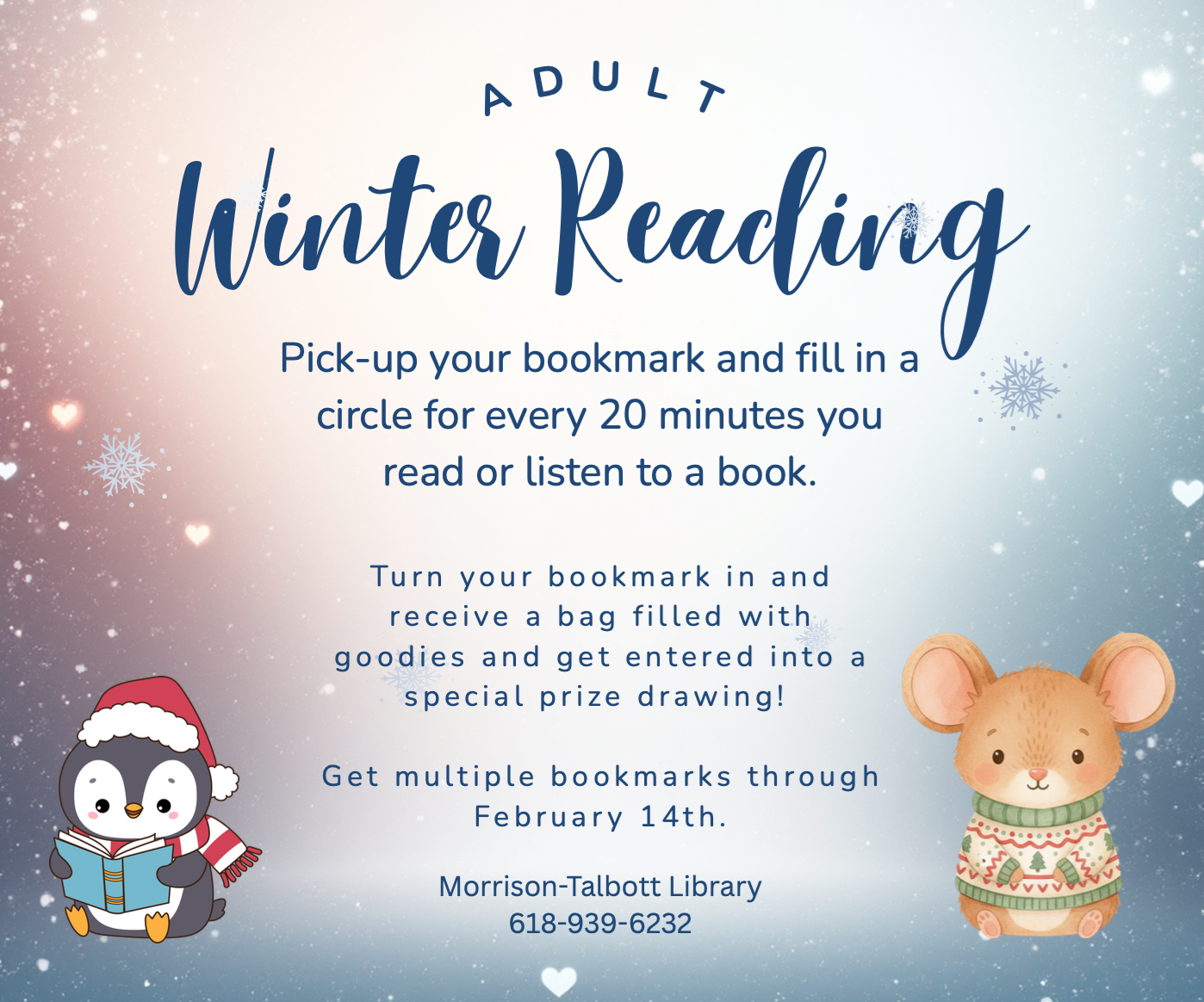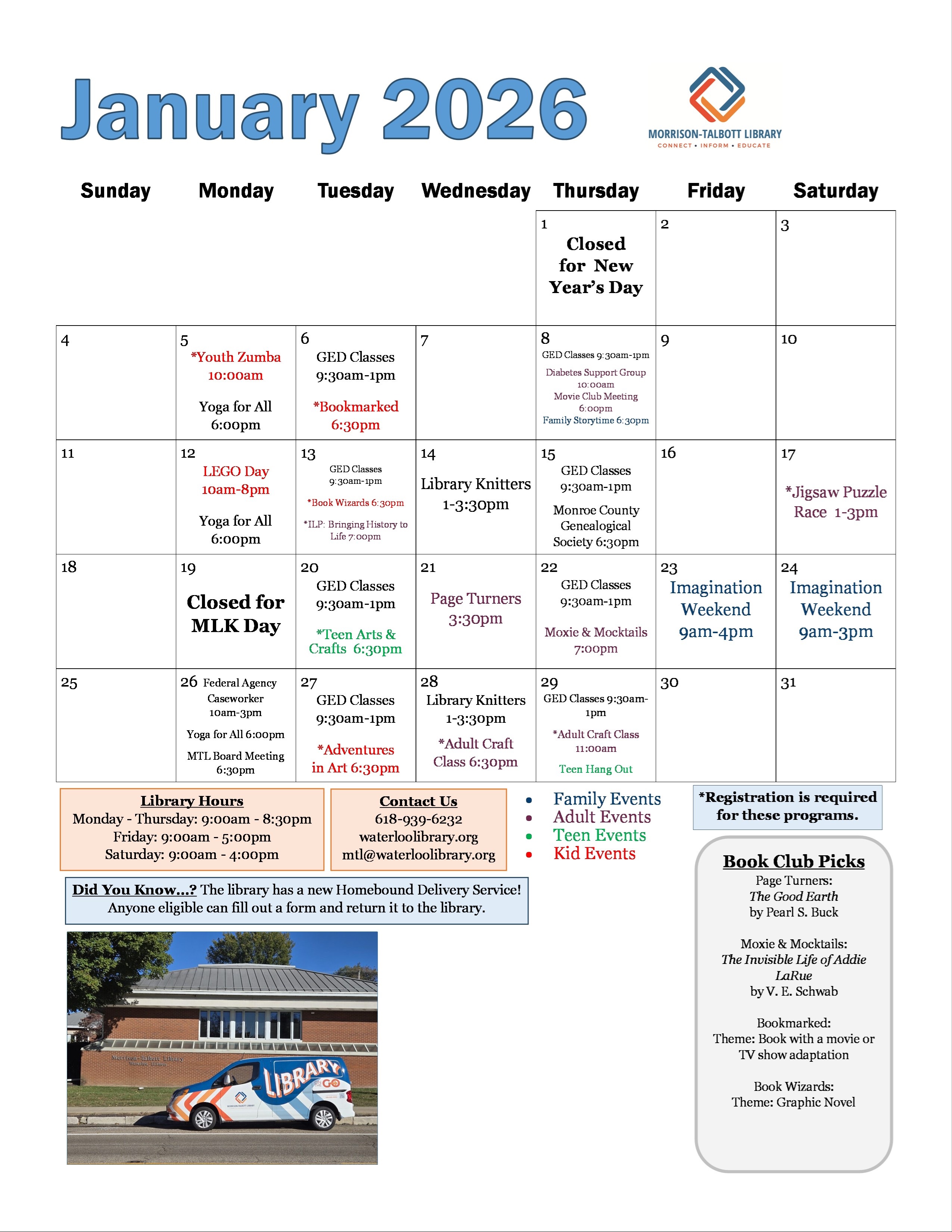 An Exciting Year Ahead at Your Library As we look ahead to 2026, I’m thrilled to share that Morrison Talbott Library has an exciting year in store! We are proud to be a vibrant part of our community, and we can’t wait to share all that’s planned with you. The best way to make sure you don’t miss a thing is to stay connected. You can subscribe to our library newsletter for regular updates, visit our website at www.waterloolibrary.org, or read our weekly library article, usually found near the classifieds in the Republic-Times. You can also follow us on social media on Facebook and Instagram for timely news, photos, and reminders. And of course, we always welcome you to stop by the library to pick up a printed calendar or event flyers. We encourage you to share library news with friends, family, and neighbors. Your enthusiasm helps spread the word about all the ways the library brings our community together. Thank you for being part of our library family. We can’t wait to experience 2026 with you!