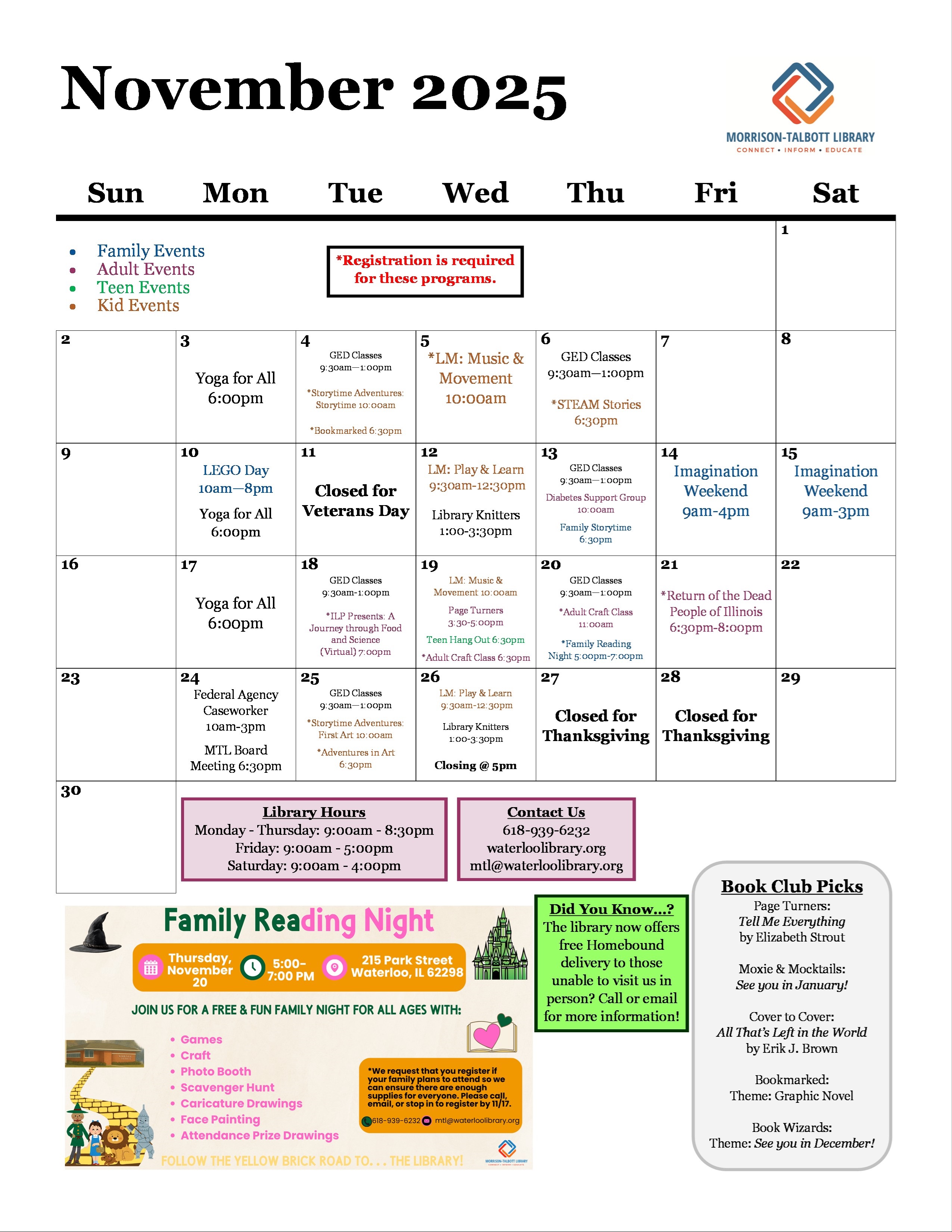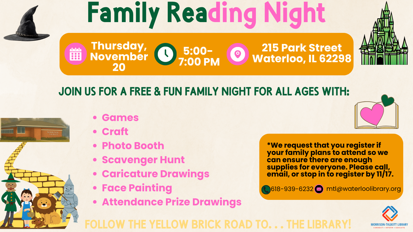 Family Events at the Library! The Morrison-Talbott Library has two free, exciting programs planned for families—mark your calendars now and join the fun! - Family Reading Night Thursday, November 20 · 5:00–7:00 p.m. Drop in anytime during this open-house event for a night filled with games, crafts, a photo booth, scavenger hunt, caricature drawings, face painting, attendance prizes, and more! Please register by November 17 so we can prepare enough supplies—email mtl@waterloolibrary.org, call 618-939-6232, or stop by the library. - Christmas Open House Thursday, December 11 · 4:30–7:30 p.m. Celebrate the season with a festive evening at the library! Visit with Santa & Mrs. Claus, make an ornament, play holiday games, enjoy a balloon artist, choose a book to take home, and more. We hope to see you at the library for one of these events or another program. Be sure to check out the youth page on our website, for a full lists of events we offer!