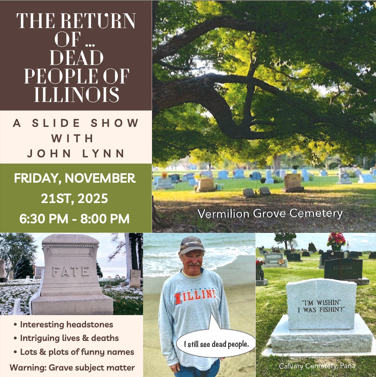 Return of Dead People of Illinois Presentation Join us at Morrison-Talbott Library on Friday, November 21 from 6:30–8:00 p.m. for “The Return of Dead People of Illinois” with storyteller John Lynn. Take a fascinating and entertaining journey through Illinois cemeteries as John shares stories of interesting headstones, intriguing lives and deaths, and the lots and plots of funny names discovered across the state. It’s a lively look at the past you won’t want to miss!